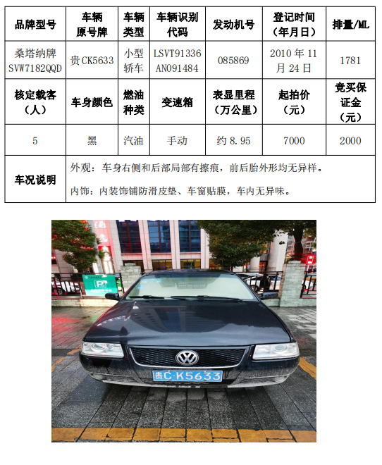 拍品編號(hào)1:桑塔納牌SVW7182QQD小型轎車一輛