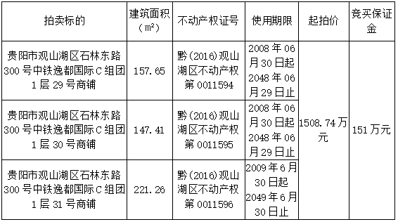 標的物位于貴陽市觀山湖區(qū)石林東路300號中鐵逸都國際C組團1層29、30、31號商鋪,共有宗地面積:75355.2㎡,總建筑面積:526.32㎡,其中: