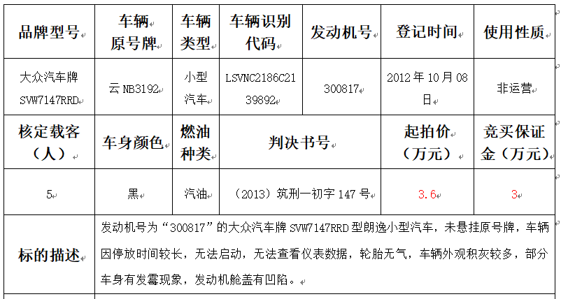 拍品編號1:大眾汽車牌SVW7147RRD朗逸小型汽車一輛