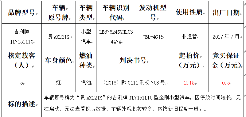 拍品編號3:吉利牌JL7151L10型金剛小型汽車一輛