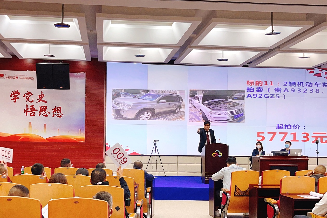 14點(diǎn),拍賣師宣讀拍賣會(huì)規(guī)則及注意事項(xiàng),拍賣會(huì)開始,競(jìng)買人紛紛舉牌競(jìng)買,其中2號(hào)標(biāo)的(貴AD6N69東風(fēng)日產(chǎn)轎車、貴A93221獵豹越野車整體拍賣)加價(jià)52手,從44,549元一路競(jìng)爭(zhēng)到96,000元拍賣成交,溢價(jià)115.49%,為全場(chǎng)競(jìng)買最激烈標(biāo)的。