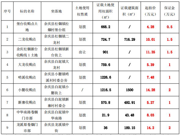 該標(biāo)的位于余慶縣松煙鎮(zhèn)松煙村堡臺(tái),證載土地面積:668.2㎡,土地使用權(quán)類型:劃撥,證載用途:煙葉收購,土地證號(hào):余國用(2007)第869號(hào)。