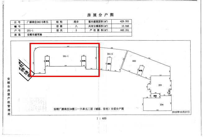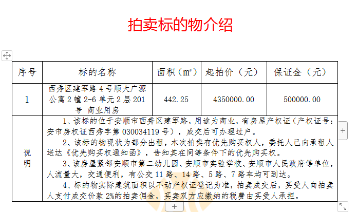1、安順市西秀區(qū)建軍路4號(hào)順大廣源公寓2幢2-6單元2層201-1號(hào)商業(yè)用房,位于地面1層(對(duì)面為安順市第二幼兒園),建筑面積約442.25㎡。
