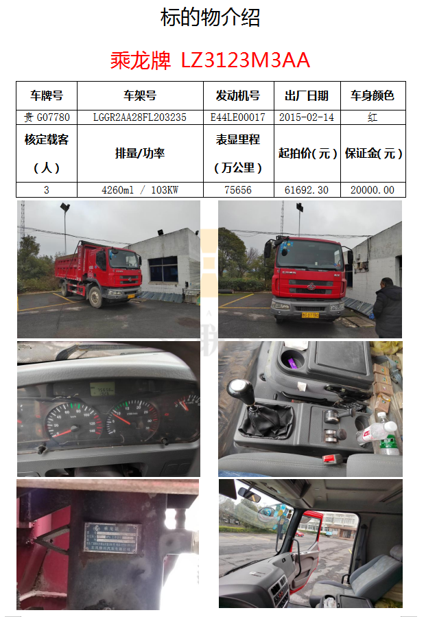 乘龍牌 LZ3123M3AA 貨車 1 輛,車牌號為貴 G07780 起拍價: ¥ 61692.30 元 保證金:2 萬元