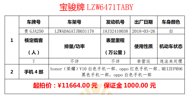 標(biāo)的一:貴GJA250寶駿牌730小型汽車一輛、honor(榮耀)V10白色手機(jī)一部、oppo紅色手機(jī)一部、MEIZUPRO6黑色手機(jī)一部,oppo白色手機(jī)一部。起拍價(jià):11664.00元,保證金:1000.00元。