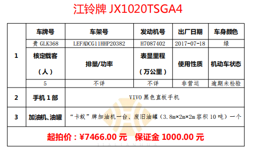 標(biāo)的二:貴GLK368 江鈴牌輕型貨車一輛、“卡蟻”牌加油機(jī)一臺、廢舊油罐(3.8m×2m×2m容積10噸)一個(gè),VIVO黑色直板手機(jī)一部。起拍價(jià):7466.00元,保證金:1000.00元。