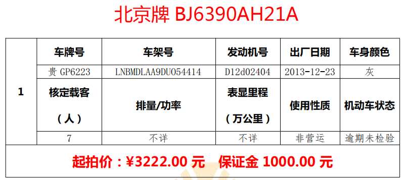 標(biāo)的三:貴GP6223北京牌小型面包車一輛。起拍價(jià):3222.00元,保證金:1000.00元